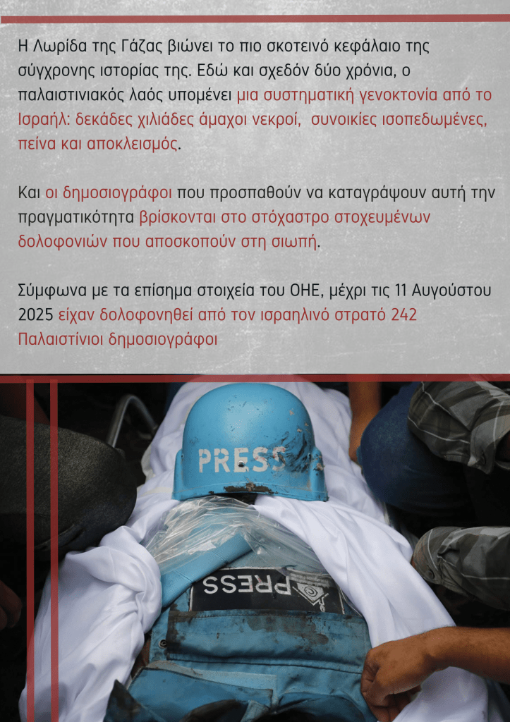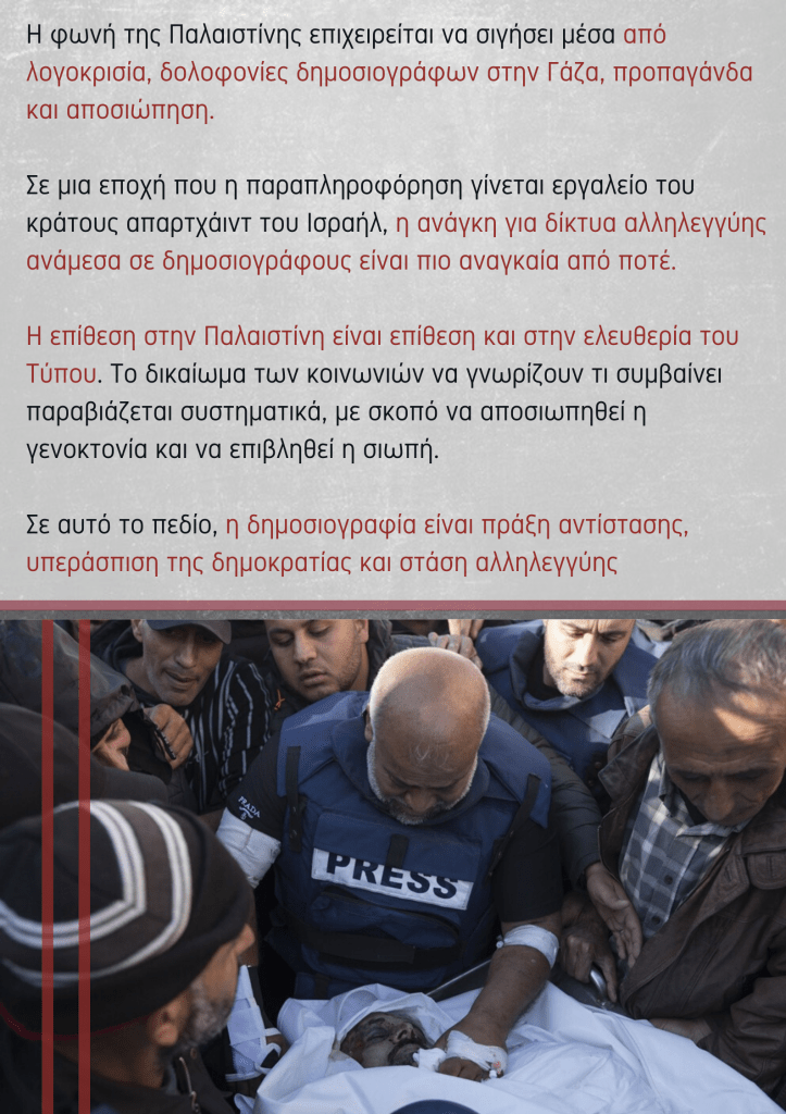 Η επίθεση στην Παλαιστίνη είναι επίθεση και στην ελευθερία του Τύπου. Το δικαίωμα των κοινωνιών να γνωρίζουν τι συμβαίνει παραβιάζεται συστηματικά, με σκοπό να αποσιωπηθεί η γενοκτονία και να επιβληθεί η σιωπή. Σε αυτό το πεδίο, η δημοσιογραφία είναι πράξη αντίστασης, υπεράσπιση της δημοκρατίας και στάση αλληλεγγύης