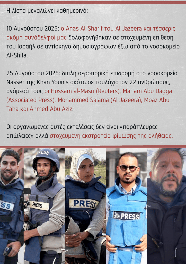 25 Αυγούστου 2025: διπλή αεροπορική επιδρομή στο νοσοκομείο Nasser της Khan Younis σκότωσε τουλάχιστον 22 ανθρώπους, ανάμεσά τους οι Hussam al-Masri (Reuters), Mariam Abu Dagga (Associated Press), Mohammed Salama (Al Jazeera), Moaz Abu Taha και Ahmed Abu Aziz. Οι οργανωμένες αυτές εκτελέσεις δεν είναι «παράπλευρες απώλειες» αλλά στοχευμένη εκστρατεία φίμωσης της αλήθειας.