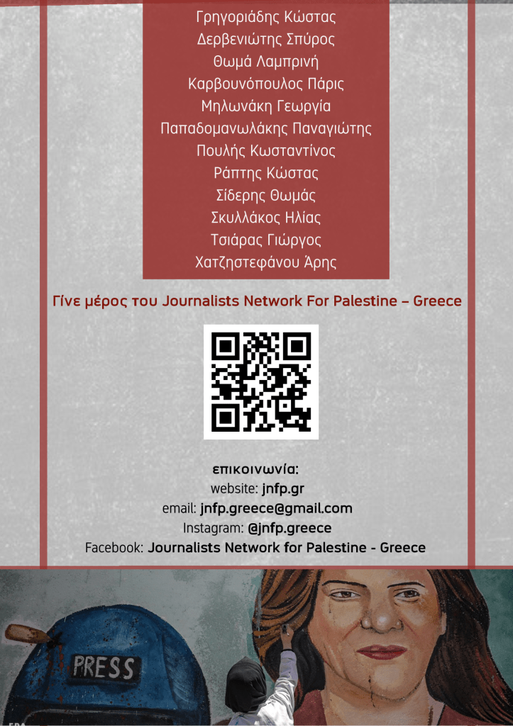 Μέσα σε αυτό το κλίμα γεννιέται το Journalists’ Network for Palestine (JNFP) – Greece, το Ελληνικό Δίκτυο Δημοσιογράφων για την Παλαιστίνη.