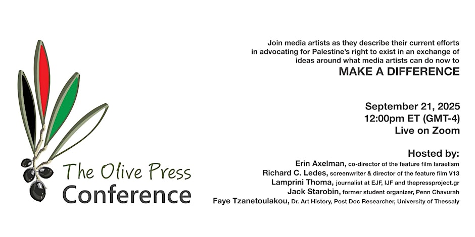 Την Κυριακή 21 Σεπτεμβρίου 2025, στις 19:00 πραγματοποιείται διαδικτυακά η διεθνής εκδήλωση The Olive Press Conference, στο πλαίσιο της Gaza Biennale 2025. Η εκδήλωση θα μεταδοθεί ζωντανά μέσω Zoom και YouTube του The Press Project.