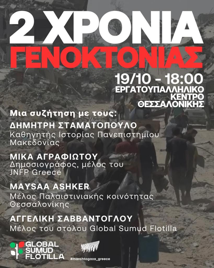 Σε αυτή την κρίσιμη στιγμή που η προσπάθεια αναδιάταξης του χάρτη της Μέσης Ανατολής συμπίπτει με το κλείσιμο ενός μεγάλου κύκλου για την πρωτοβουλία μας, αυτόν της ανθρωπιστικής αποστολής Global Sumud Flotilla, τα ερωτήματα πολλαπλασιάζονται ενώ η στήριξη του αγώνα των Παλαιστινίων για ελευθερία και αξιοπρέπεια παραμένει επιτακτική. Σε αυτά τα πλαίσια, διοργανώνουμε στις 19 Οκτωβρίου και ώρα 18:00 στο Εργατοϋπαλλιλικο Κέντρο Θεσσαλονίκης (Ε.Κ.Θ.) μια εκδήλωση-συζήτηση στη Θεσσαλονίκη, με τίτλο «Παλαιστίνη: 2 χρόνια γενοκτονίας & το διεθνές κίνημα αλληλεγγύης»,