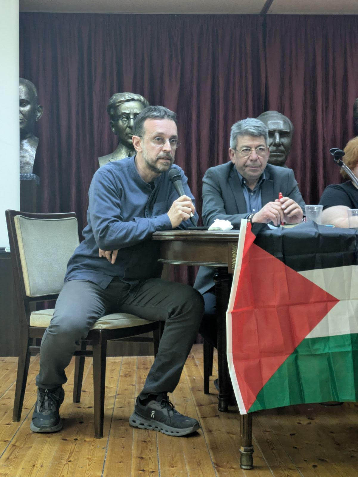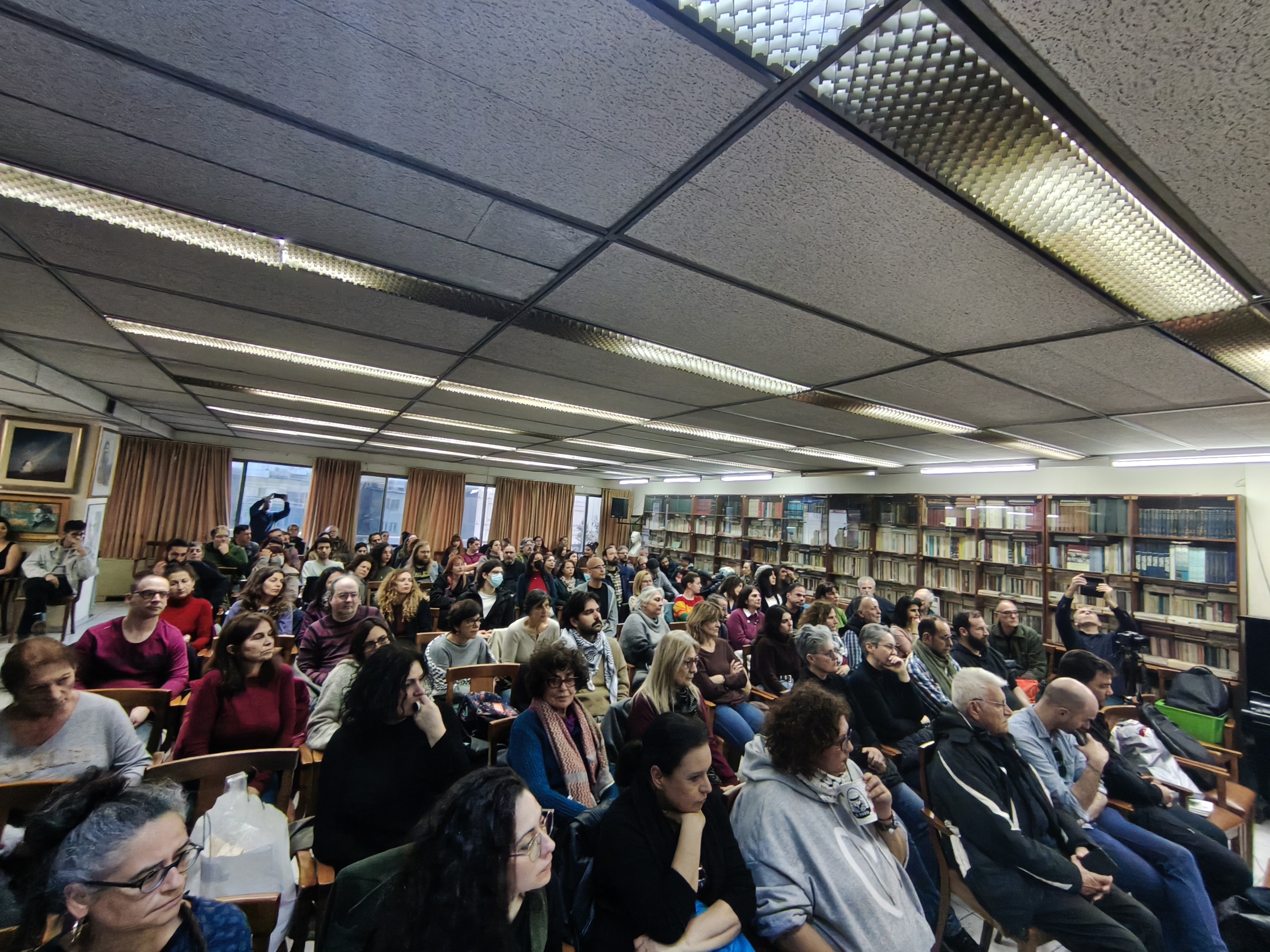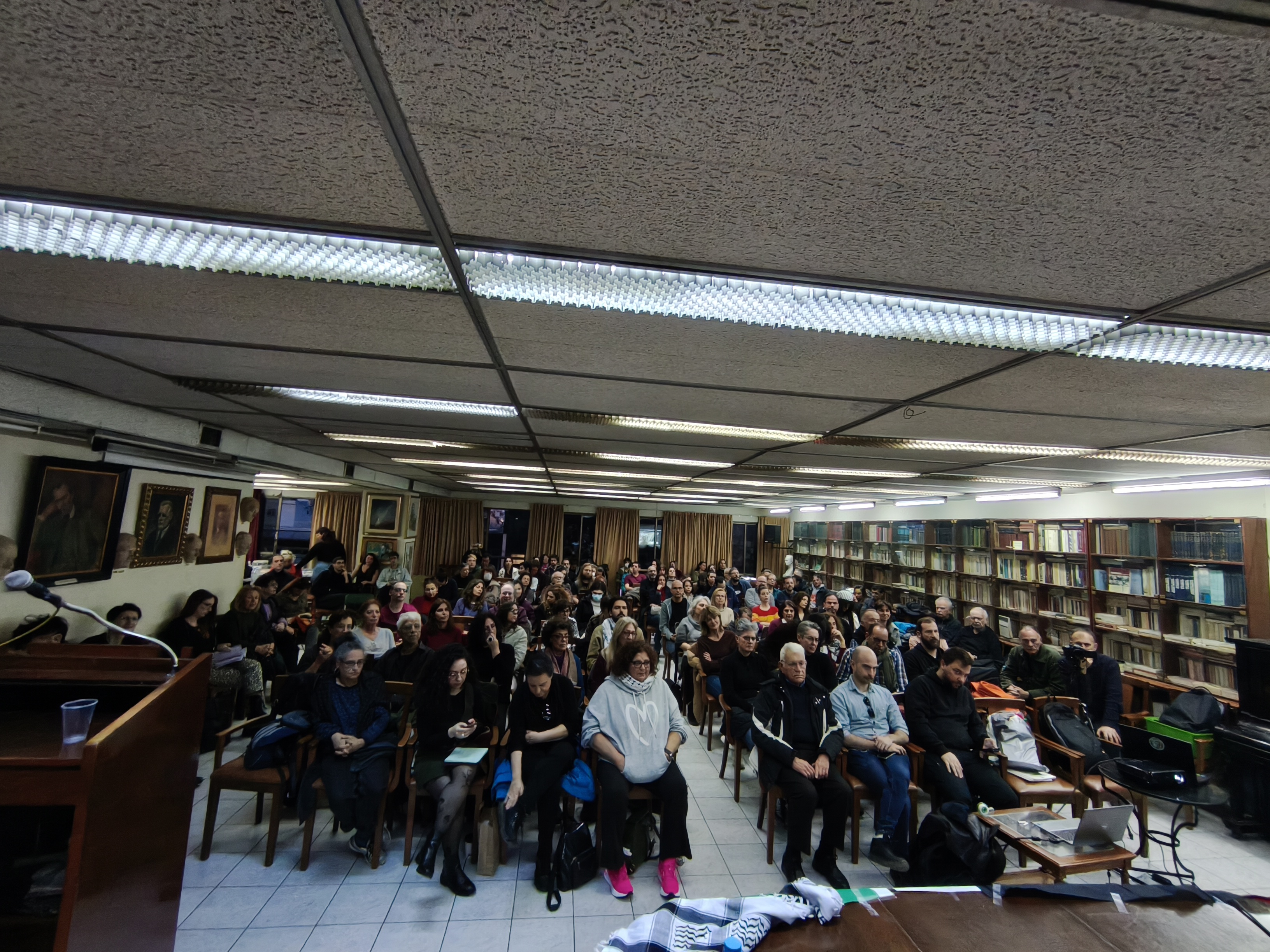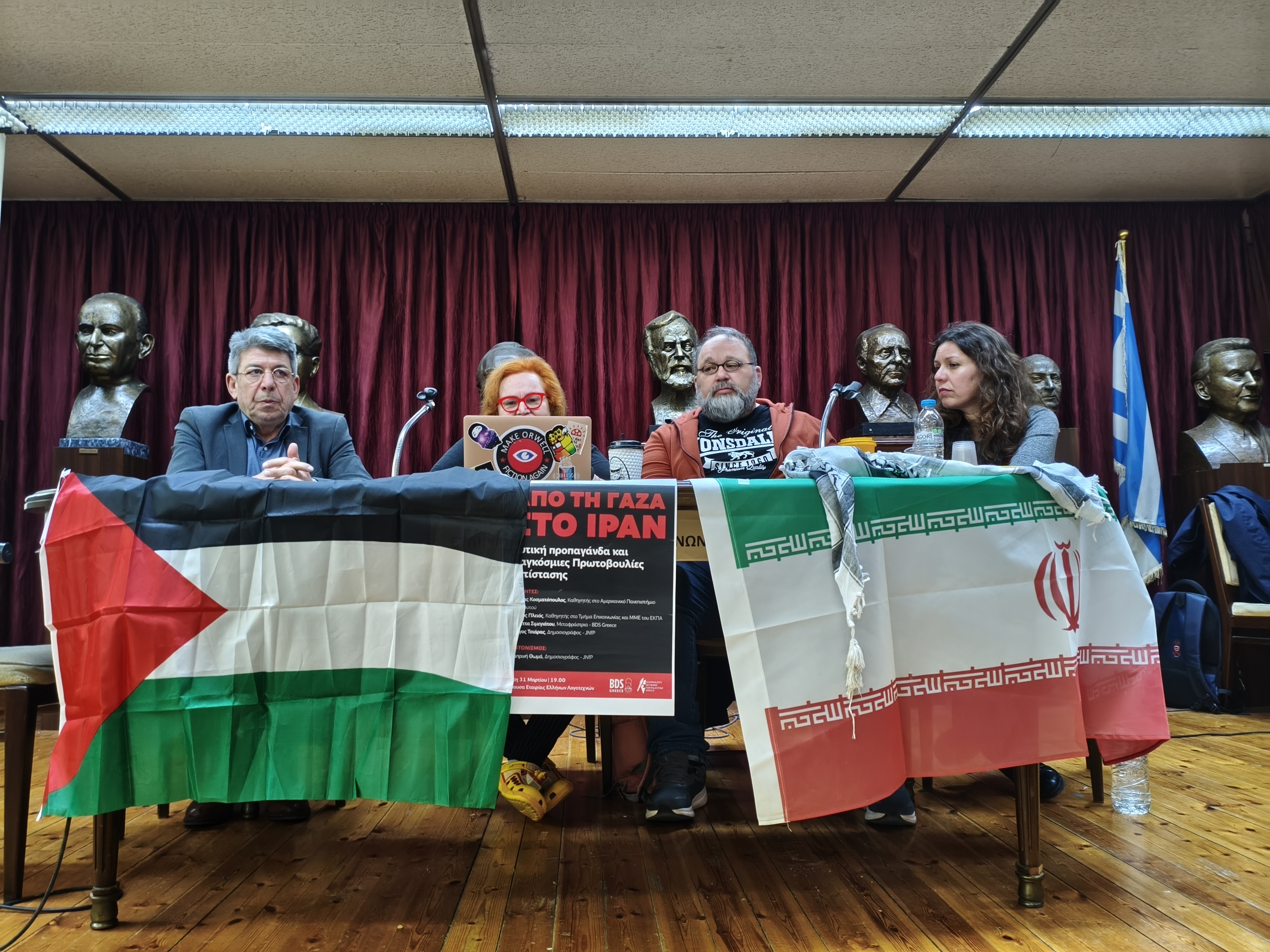 Με τη μαζική συμμετοχή του κόσμου και μια αίθουσα ασφυκτικά γεμάτη πραγματοποιήθηκε η εκδήλωση με θέμα «Από τη Γάζα στο Ιράν: Δυτική προπαγάνδα και παγκόσμιες πρωτοβουλίες αντίστασης», που διοργανώθηκε χθες από το Journalists Network for Palestine Greece και το BDS Greece στην αίθουσα της Εταιρείας Ελληνων Λογοτεχνών .